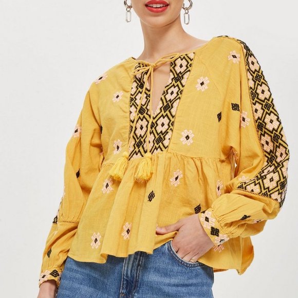 Topshop Yellow Embroidered Smock Top