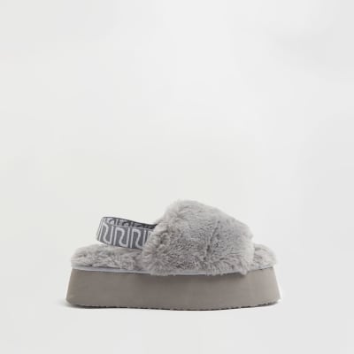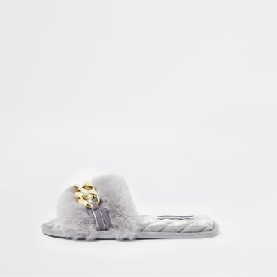 Grey faux fur open toe slippers | River